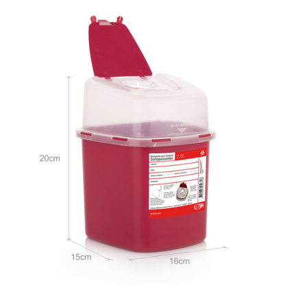 El guardián recolector de 2.8 lts de Estra está fabricado en plástico resistente para almacenar residuos cortopunzantes como agujas y lancetas o ampollas usadas en el sector de la salud.