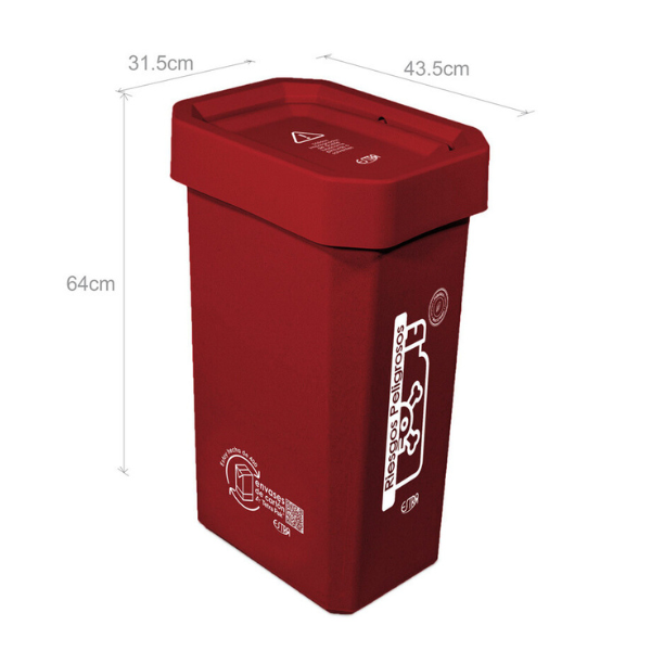 Deposita en la papelera roja de 53 lts para residuos peligrosos materiales que representen un peligro físico o químico.